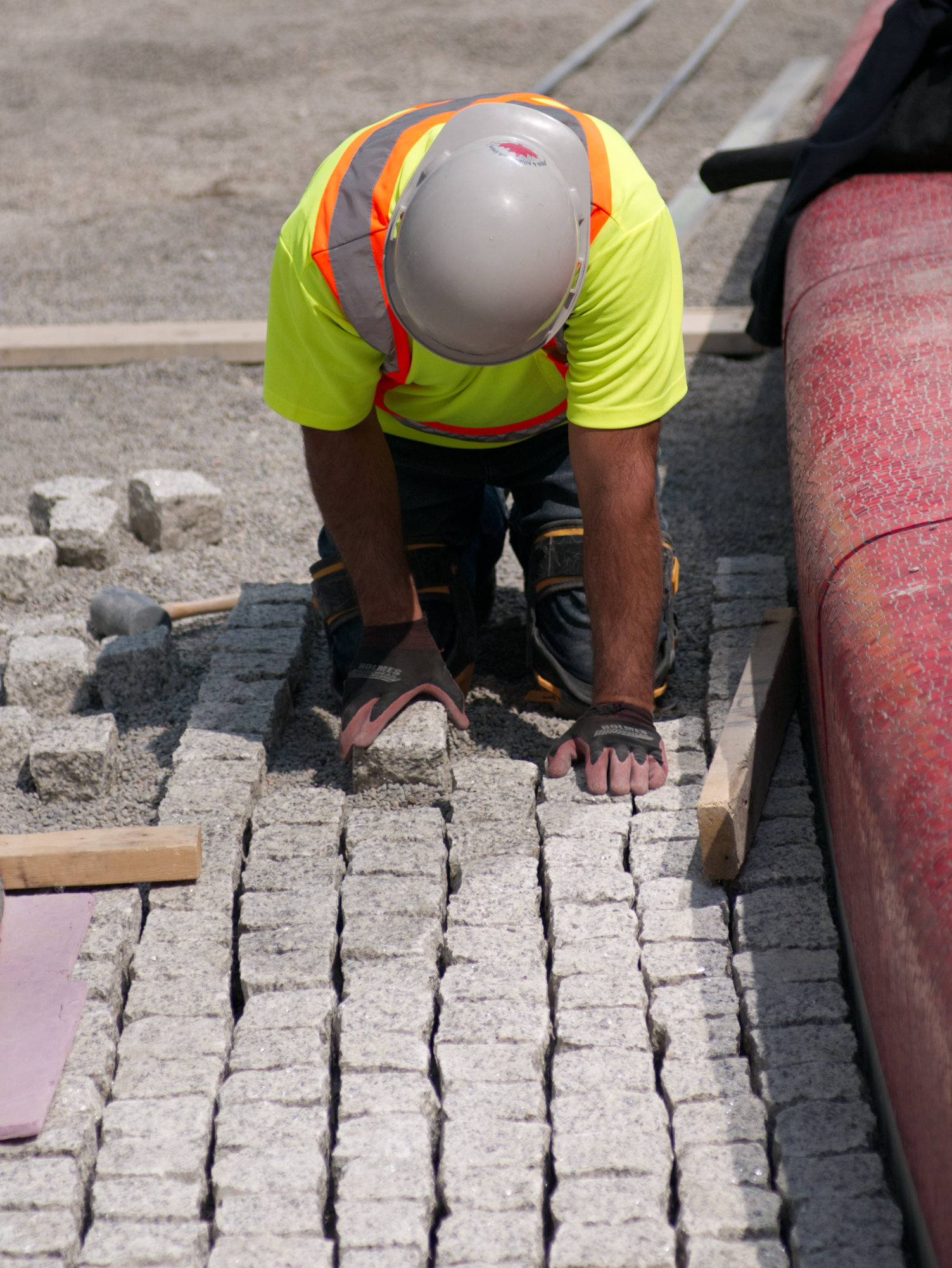 Quebec granite blocks, just laid, (with polymeric sand between those laid earlier)