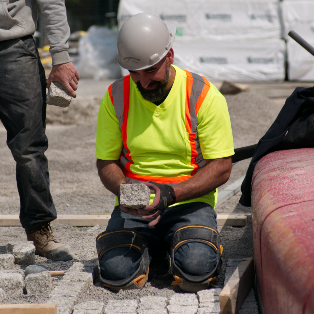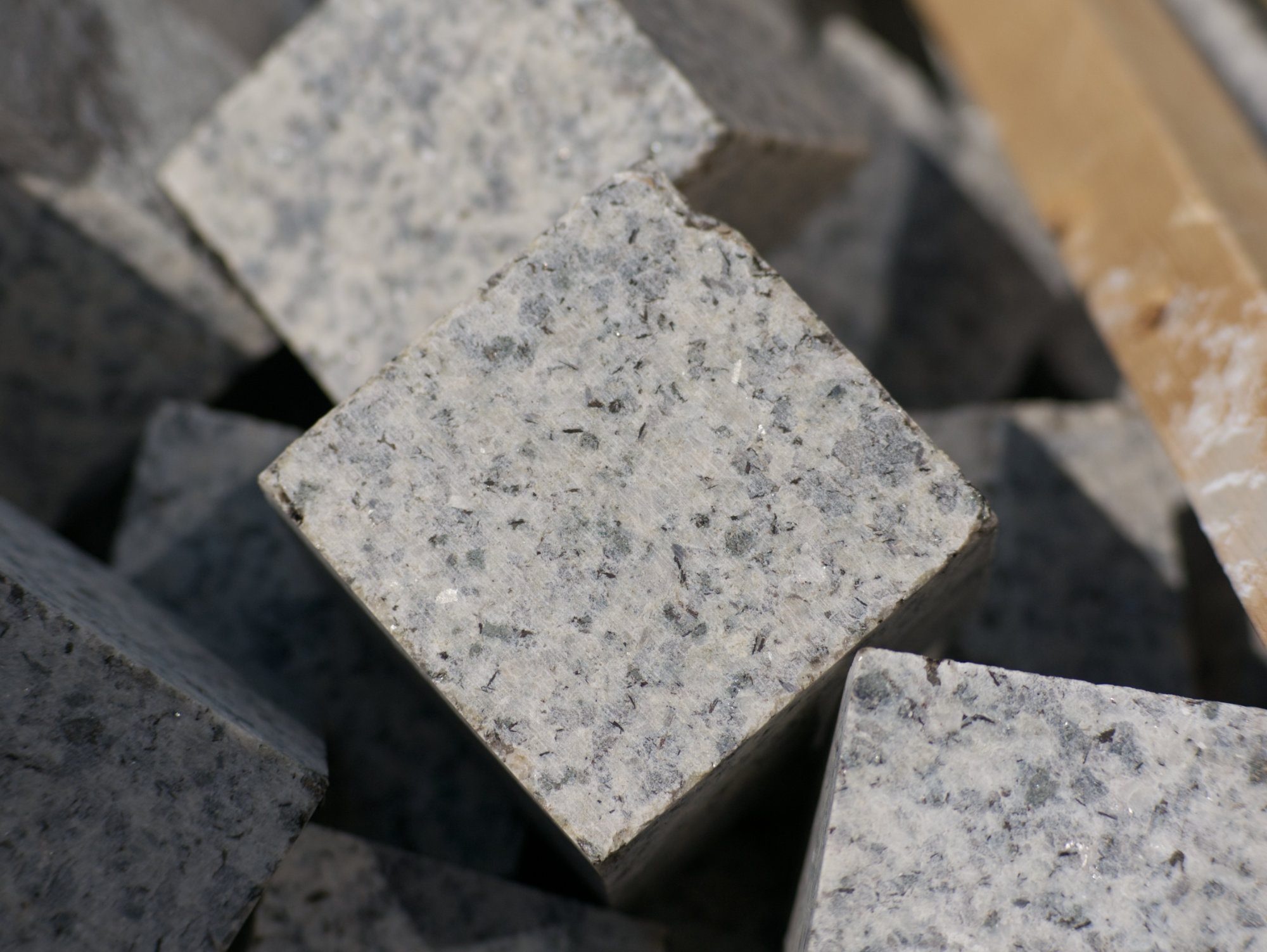 I began this work in May 2023, meeting Albert and his crew of pavers at Love Park, with the aim of finding out more about how the granite is handled once it arrives at the waterfront, and to pick-up some video footage of the team laying granite setts – small granite blocks, laid by hand. Albert is responsible for the planning and implementation of all the stone paving that surrounds the heart-shaped pond at the centre of this new park. This is both intricate and back-breaking work, with the team undertaking 12 hour shifts three days per week over a 6 month period. Each block weighs up to 2kg each and has to be "weighed" by hand and eye before being positioned. These are laid onto a substrate of HPB (High Performance Bedding) – gravel-like, pea-sized pieces of limestone – which the team has to spread and levelled beforehand using a long plank of timber. The paving must conform to the ground-profile of the park, enabling water run-off towards drainage, and also has to neatly abutt both the heart-shaped pool and the grass that surround it on each side. The team are working with two types of granite sett: the first is from a company in Galicia in Spain and comes in flame and high-pressure water, and dark finishes; and the second comes from Quebec, supplied by Polycor Natural Stone.
