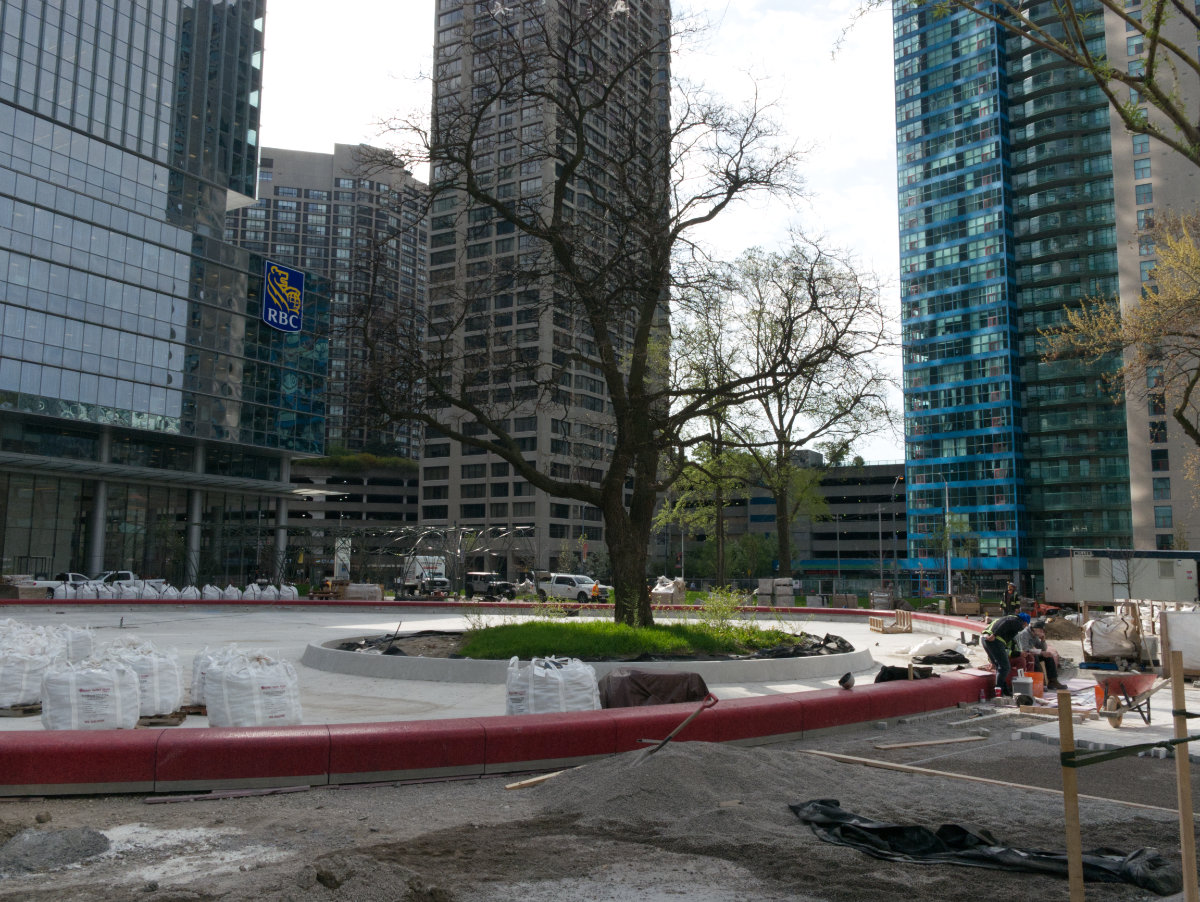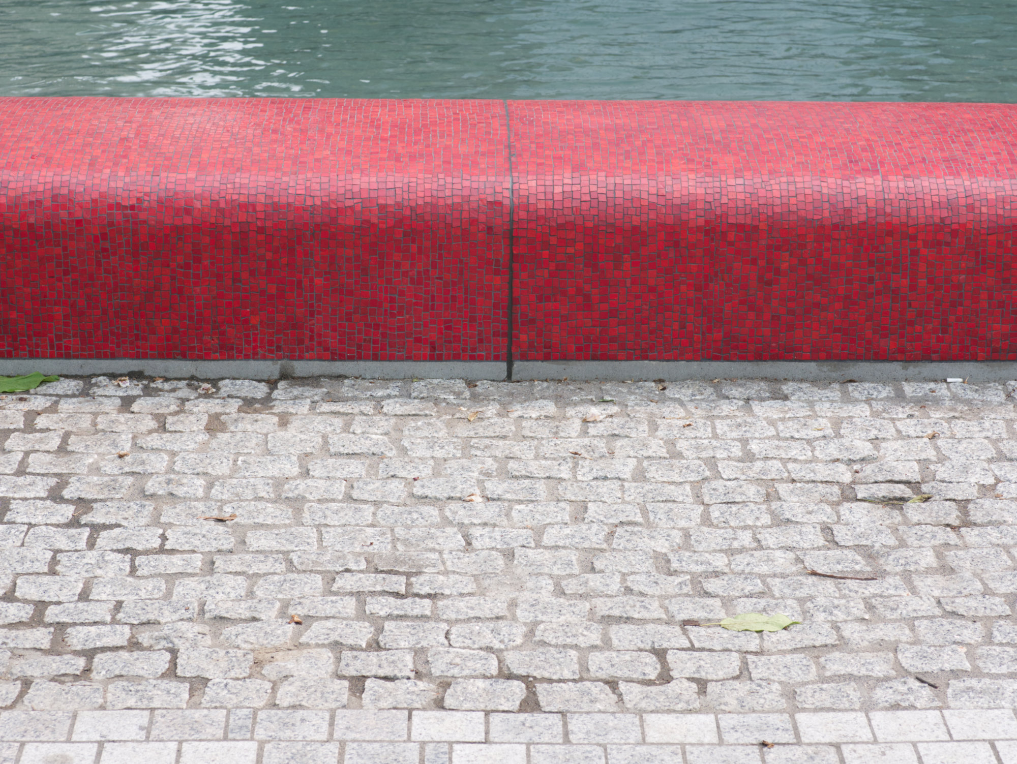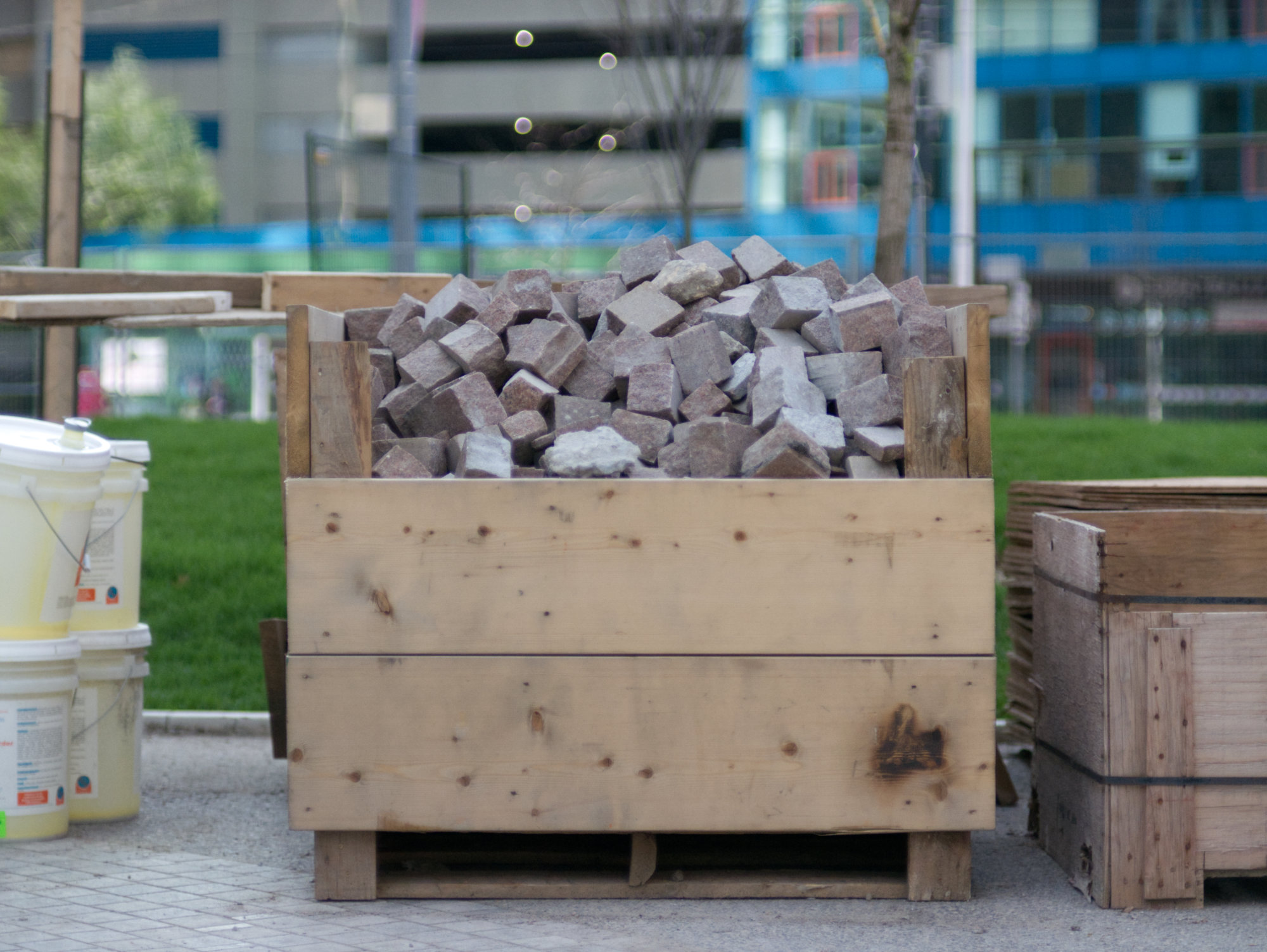 These setts are laid in distinct bands around the pool: the outermost is made from the Spanish stone, laid in a 40-40-20 ratio of different finishes; the inner rows are of the Quebec granite which has a rougher, less regular profile. (These are similar to the ones laid along the rest of the Waterfront to form the maple leaf motif.) Each row is laid by hand, with one of the team carrying a small number of blocks to the other two team-members. The two team-members laying the blocks will kneel facing each other but on different, adjacent rows. They each use a levelling block – a piece of timber – to guage the level or incline required, and then weigh a block by eye and by hand before placing it into the HPB granules. The HPB has been levelled previously, but each block demands some additional granules to be scraped or scooped by hand to fit its irregular lower-surface and maintain the level. A rubber or metal mallet is used to tap the block into place.