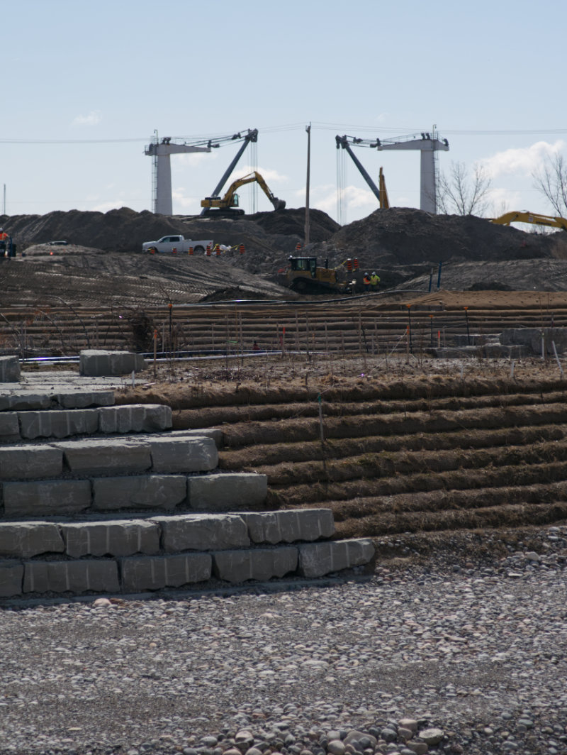 I'm looking at a scene of what might be a river. There's some standing water in front of me. And I'm up high on a hill and I can see what looks like a road. And between me and the standing water is a rough dark-coloured route along the bank, along this curved embankment. Along the other side of the road or the river bed are some stepped, brown-coloured soft round terraced-like things that look like they're being held by fabric or coir fabric; they're very straight vertically, but they are very curved horizontally. They're very flat against the horizon but they're running along the curve for probably a kilometre of these terraces; and interrupting the terraces – on the same sort of slope – is a set of stone steps; and they're also flat; and there's one, two , three, four, five, six stone steps, and a flat sort of patio; and in set into the terraces… there's a lot of flashing, flickering, sparkling tapes all around on the embankment, and the embankment slopes; and everywhere where it's brown there are sparkles. I can see in the mid-distance a small bridge that looks like people – pedestrians – could walk across it; and behind that is a line of hydro-lines; a line of poles with wires strung up at the very top; and behind the stone steps in the distance against the horizon – on a sunny, sunny day – are two crane-type objects; they're very solid, not lacy as cranes normally are. They sort of look like the bottom of windmills, but cut-off at the knees. In front of those, there's a great big excavator sitting on top of a hill, and a number of excavator equipment and lots of people walking around with white helmets and orange vest with Xs on their backs. Lots of different vehicles moving things around,. I think there's some kind of pop-up tent in the distance. There are lots of piles of dirt, of different shapes: some are long, and some are triangular; some are longer; and they all look like they're about the same colour; and then a little further to the right I see a lot of poles; and I think they're masts. I don't believe they're power lines, because they have rigging coming down from them, so maybe they're stored dry-docked yachts or something; and in front of them is a great bug structure, made out of steel and it's – I know it's a bridge – but it's an operating bridge so it has two very heavy, very, very large, white weights that presumably help it to open up; but they look like shovels or teeth; and the steel of the bridge is painted green which matches nicety to the screen which is not too far from it. In the distance, against the blue, blue sky; and that screen is… I see the back of it and the back of it is greeen and rusty, and it looks like a drive-in screen; and you can't see the front part; between the screen and me, operating in one of the dirt piles is another excavator; and between the excavator and us is a kite: it's a fake bird that's tied to something and it's just sort of floating and flipping in the air against the horizon.